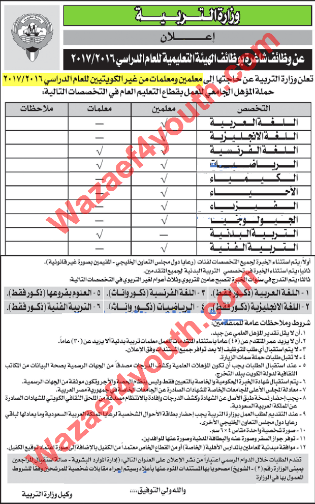 اعلان وظائف وزارة التربية والتعليم بدولة الكويت مدرسين ومدرسات ج التخصصات للعام الدراسي 2016 2017